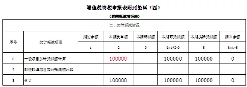 2、由于适用加计抵减政策,本月100万进项可以加计抵减额为10万。通过附列资料(四)填报,只需填报第2列本期发生额,其余列次系统会自动计算带出: